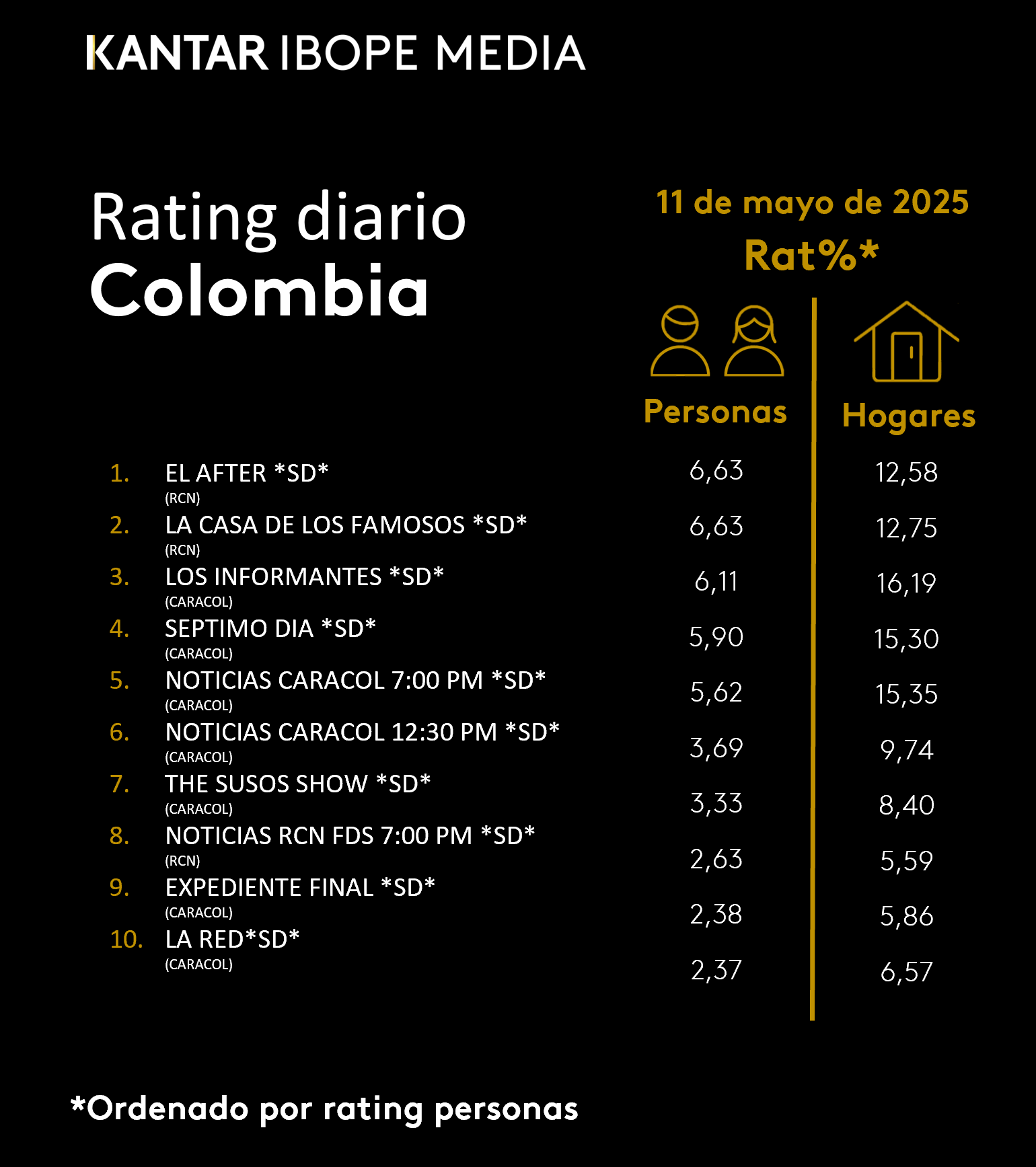 INICIO > ÍNDICES DE SINTONÍA - CORTESÍA DE KANTAR IBOPE MEDIA > 11 DE MAYO DE 2025