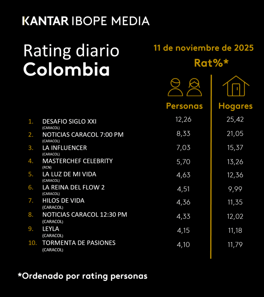 INICIO > ÍNDICES DE SINTONÍA - CORTESÍA DE KANTAR IBOPE MEDIA > 11 DE NOVIEMBRE DE 2025