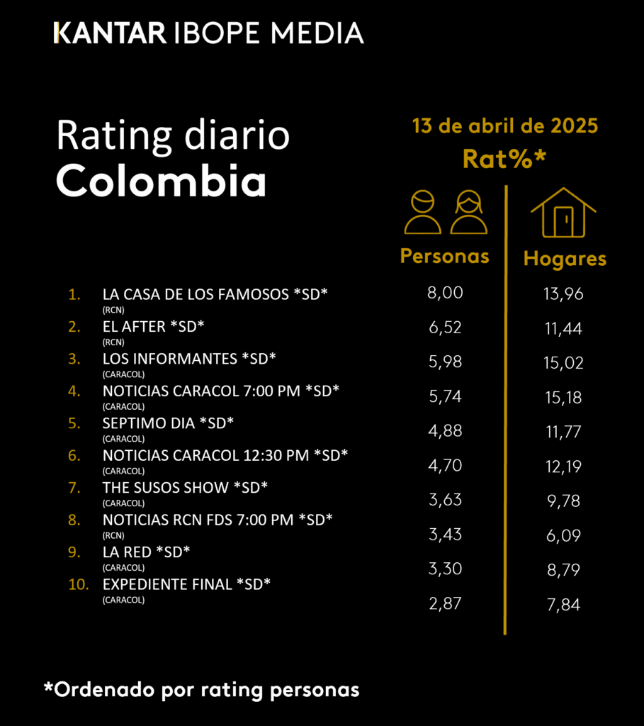 INICIO > ÍNDICES DE SINTONÍA - CORTESÍA DE KANTAR IBOPE MEDIA > 13 DE ABRIL DE 2025