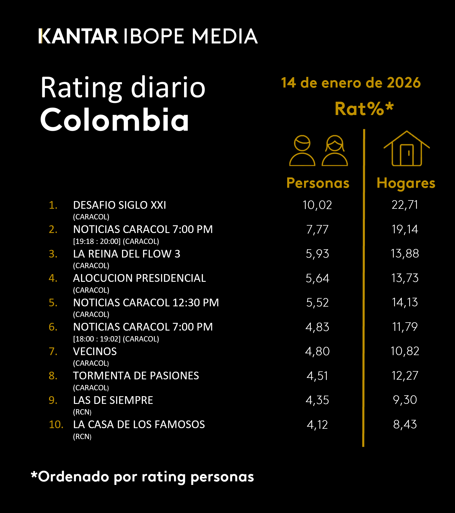 INICIO > ÍNDICES DE SINTONÍA - CORTESÍA DE KANTAR IBOPE MEDIA > 14 DE ENERO DE 2026