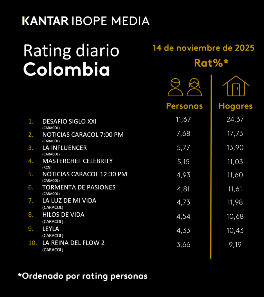 INICIO > ÍNDICES DE SINTONÍA - CORTESÍA DE KANTAR IBOPE MEDIA > 14 DE NOVIEMBRE DE 2025
