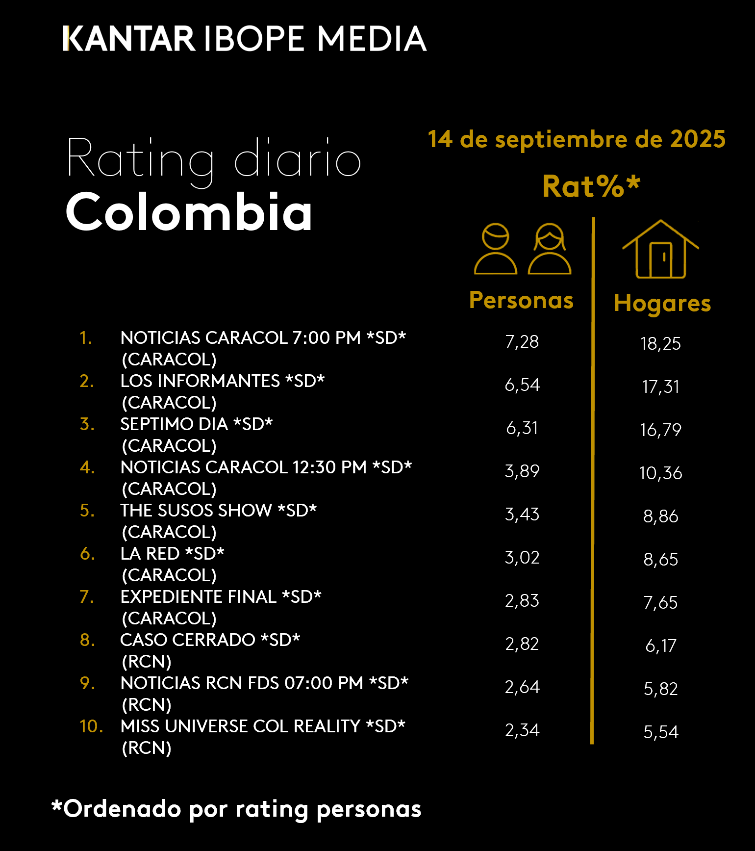 INICIO > ÍNDICES DE SINTONÍA - CORTESÍA DE KANTAR IBOPE MEDIA > 14 DE SEPTIEMBRE DE 2025