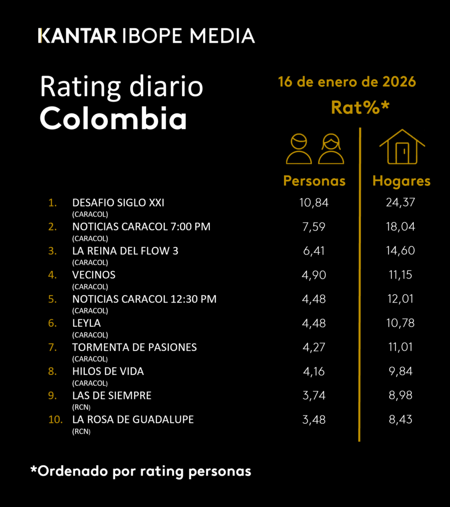 INICIO > ÍNDICES DE SINTONÍA - CORTESÍA DE KANTAR IBOPE MEDIA > 16 DE ENERO DE 2026