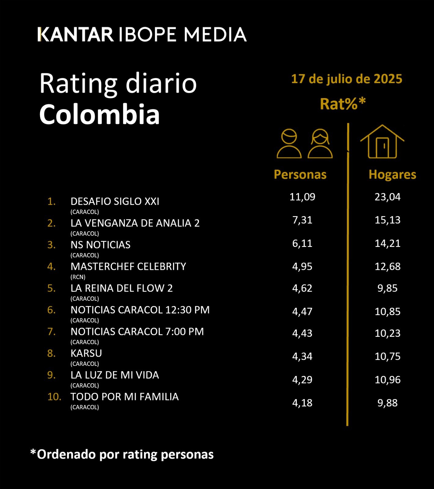 INICIO > ÍNDICES DE SINTONÍA - CORTESÍA DE KANTAR IBOPE MEDIA > 17 DE JULIO DE 2025