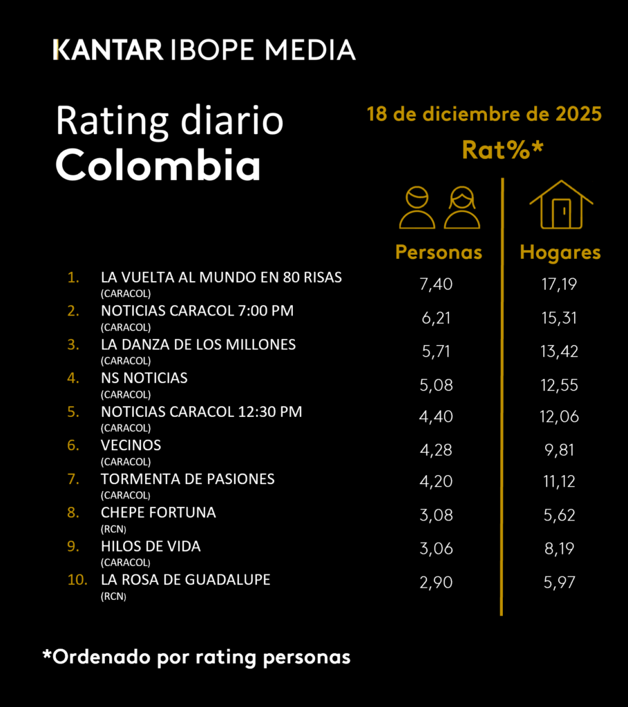 INICIO > ÍNDICES DE SINTONÍA - CORTESÍA DE KANTAR IBOPE MEDIA > 18 DE DICIEMBRE DE 2025