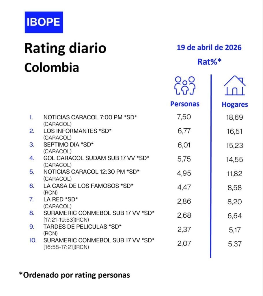 INICIO > ÍNDICES DE SINTONÍA - CORTESÍA DE KANTAR IBOPE MEDIA > 19 DE ABRIL DE 2026