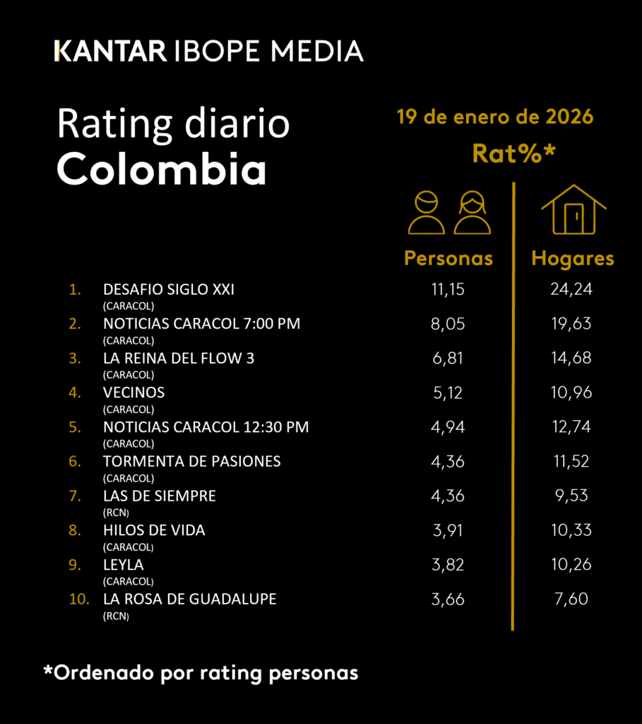 INICIO > ÍNDICES DE SINTONÍA - CORTESÍA DE KANTAR IBOPE MEDIA > 19 DE ENERO DE 2026