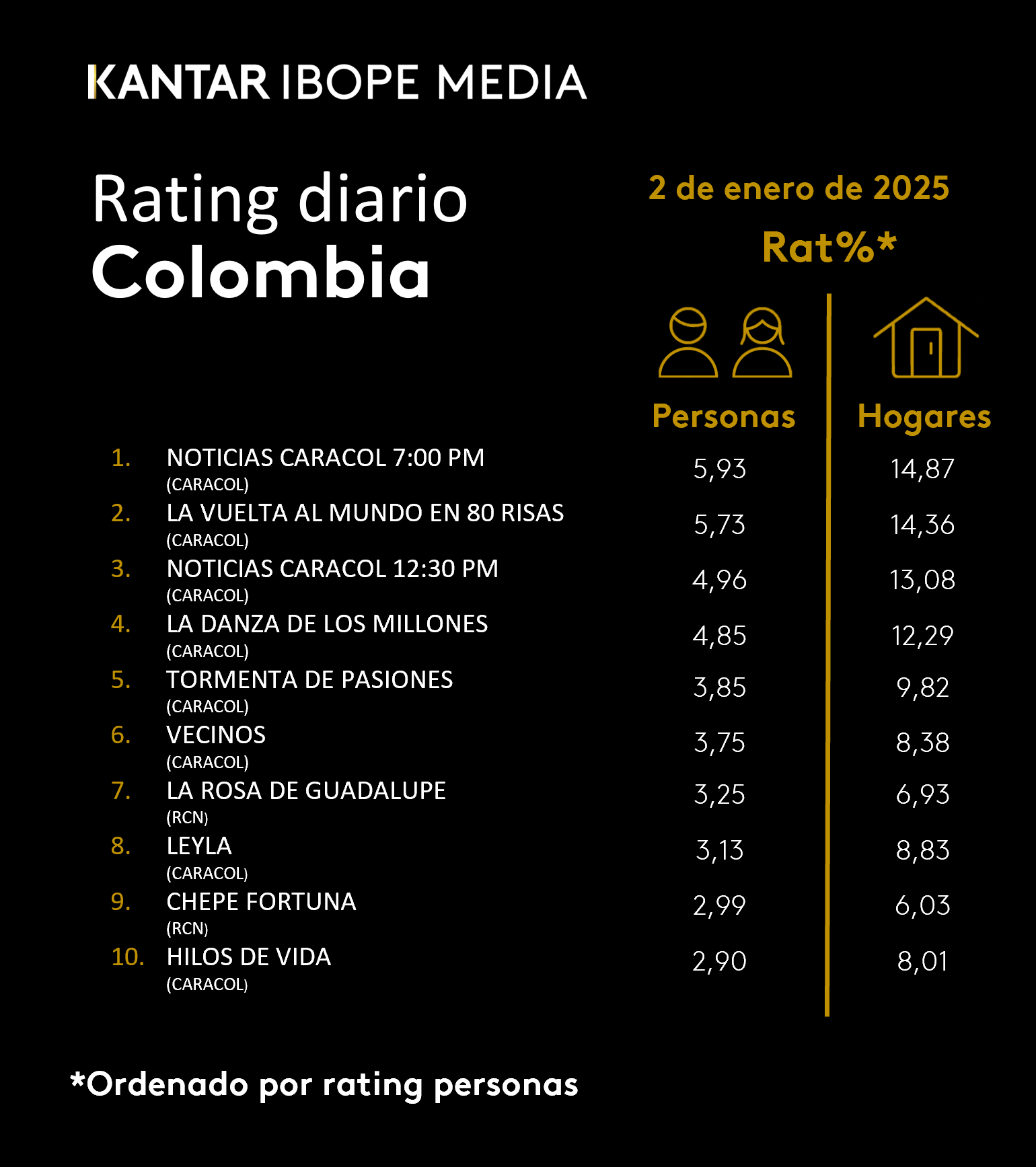 INICIO > ÍNDICES DE SINTONÍA - CORTESÍA DE KANTAR IBOPE MEDIA > 2 DE ENERO DE 2026