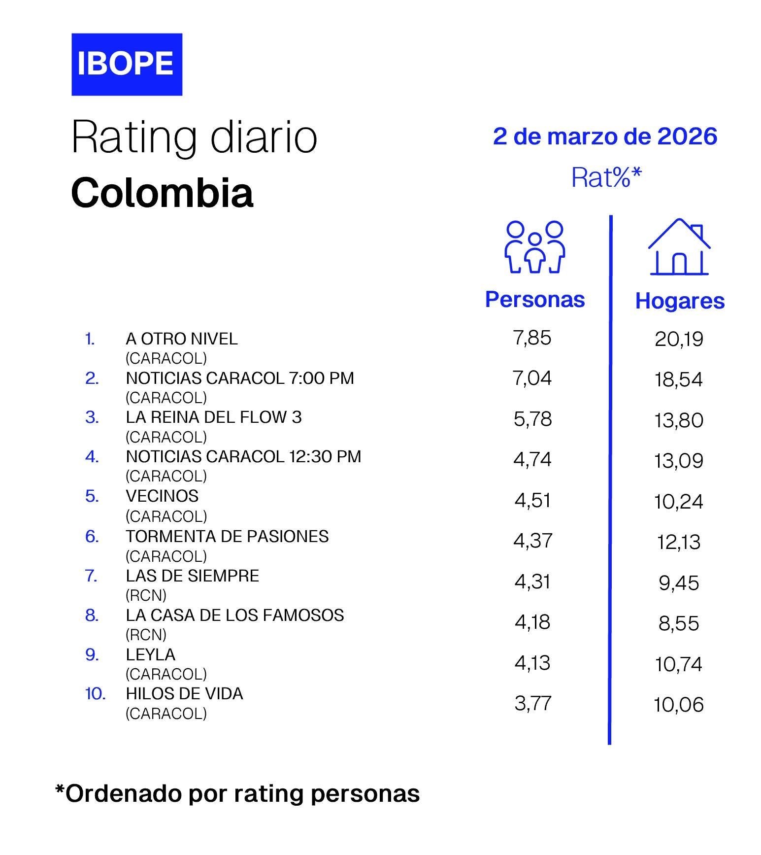 INICIO > ÍNDICES DE SINTONÍA - CORTESÍA DE KANTAR IBOPE MEDIA > 2 DE MARZO DE 2026