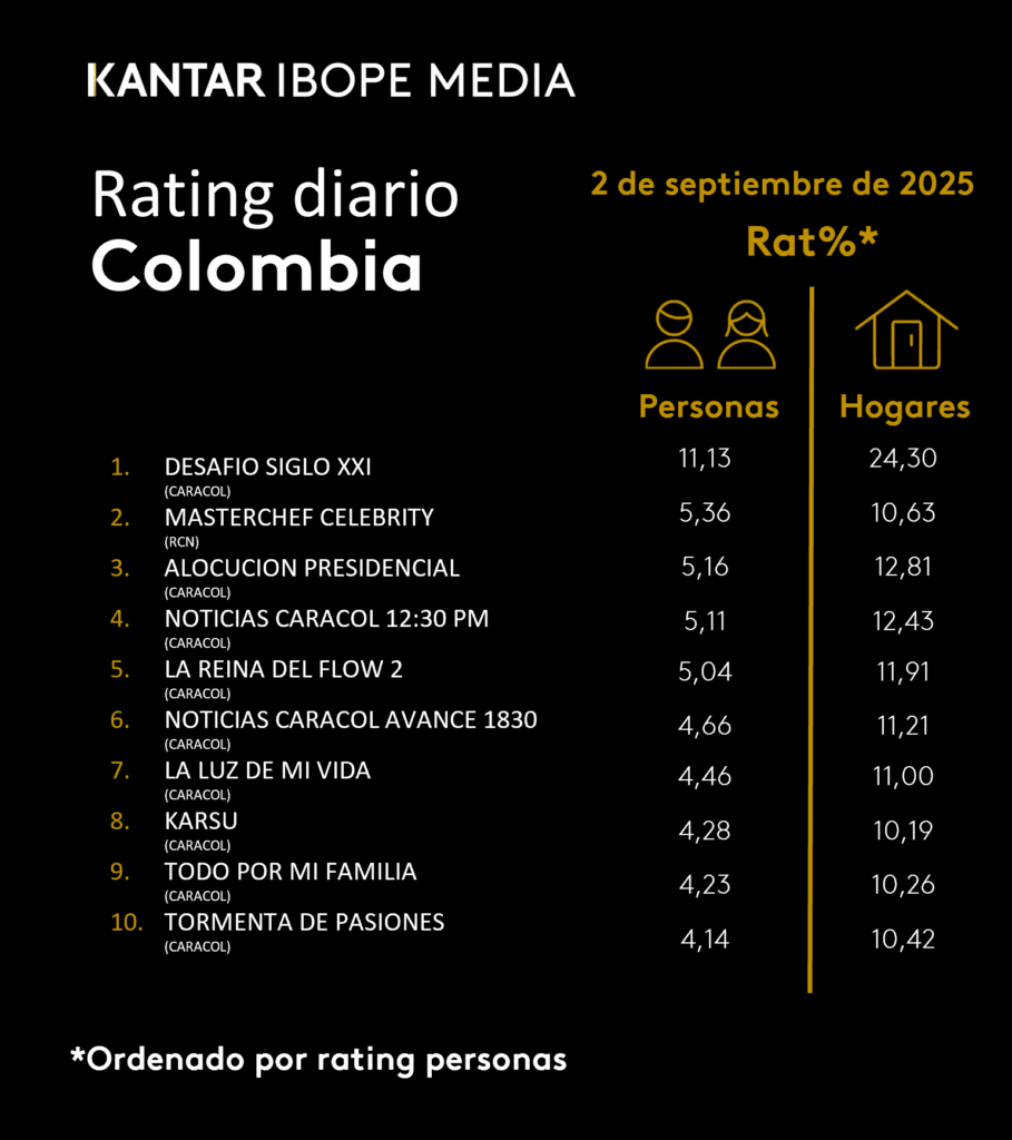 INICIO > ÍNDICES DE SINTONÍA - CORTESÍA DE KANTAR IBOPE MEDIA > 2 DE SEPTIEMBRE DE 2025