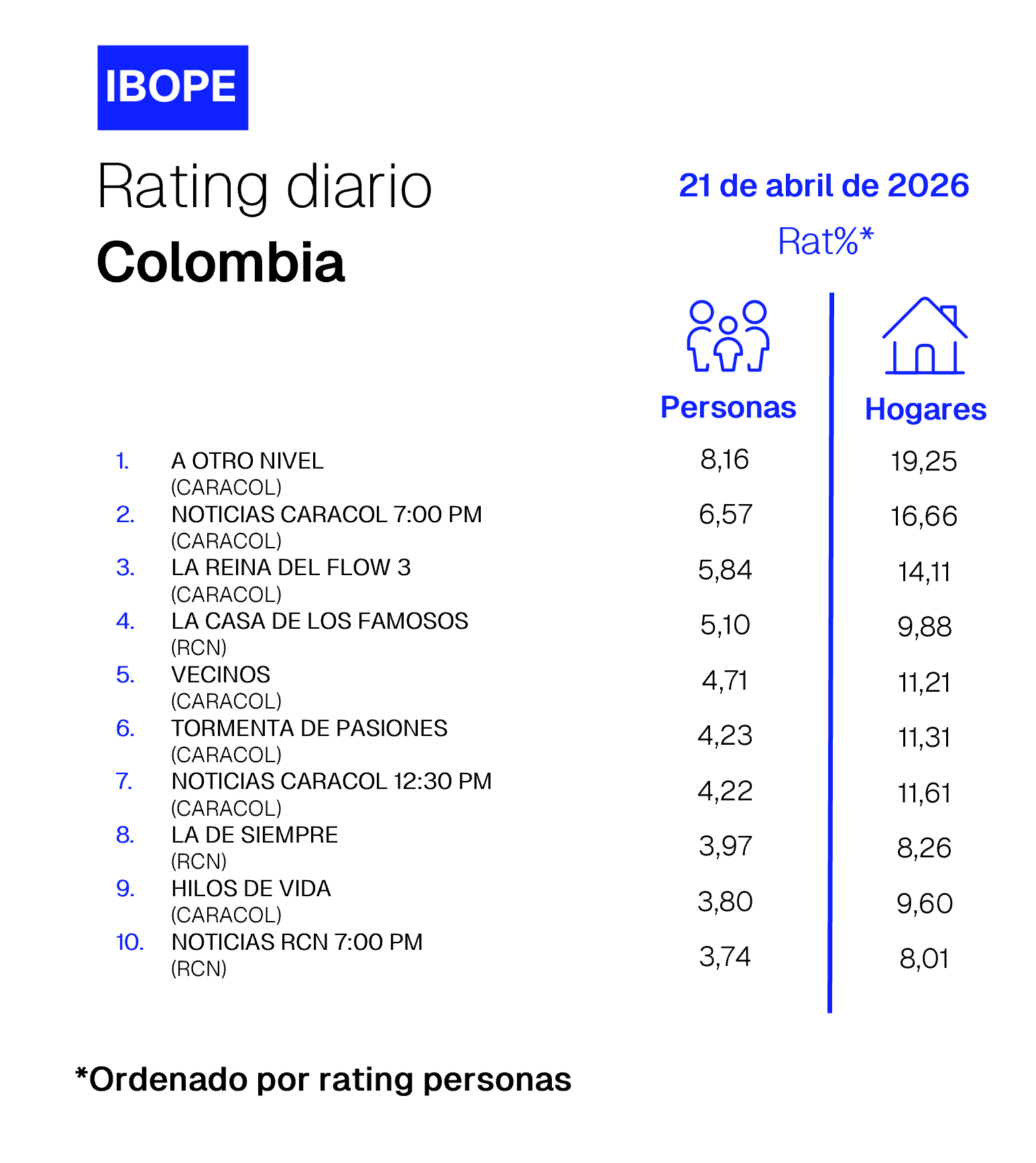 INICIO > ÍNDICES DE SINTONÍA - CORTESÍA DE KANTAR IBOPE MEDIA > 21 DE ABRIL DE 2026