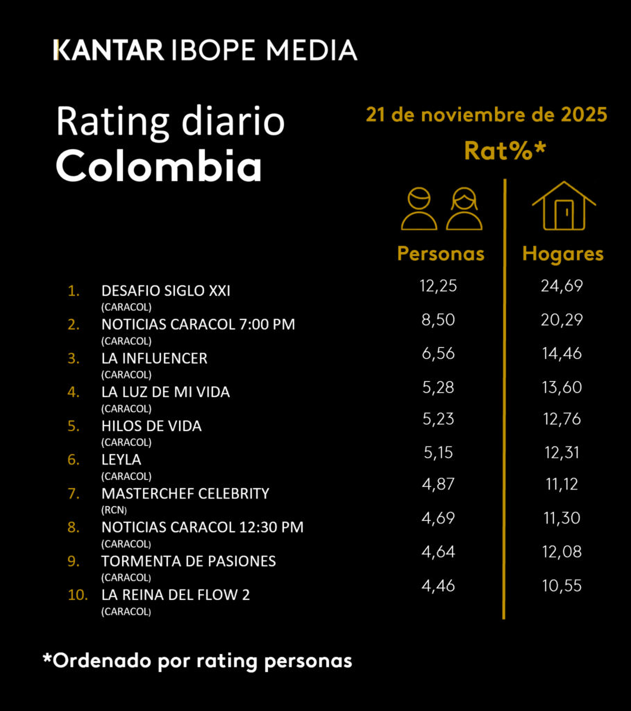 INICIO > ÍNDICES DE SINTONÍA - CORTESÍA DE KANTAR IBOPE MEDIA > 21 DE NOVIEMBRE DE 2025