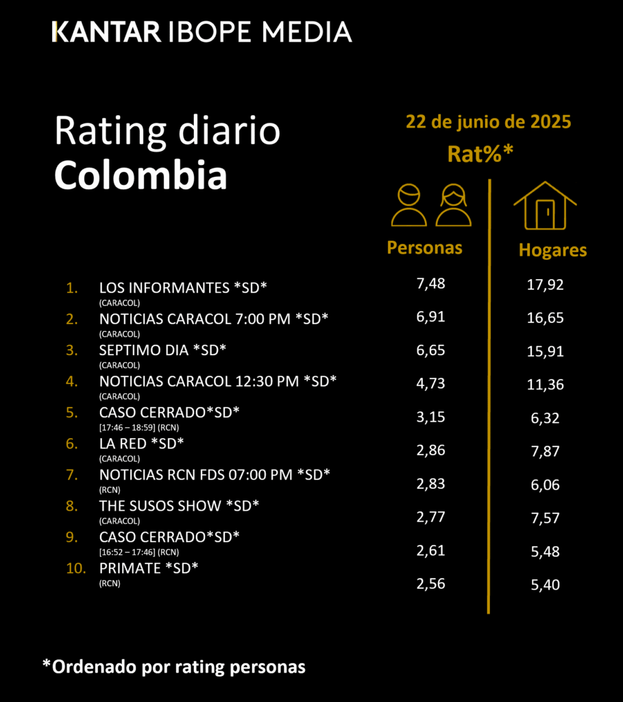 INICIO > ÍNDICES DE SINTONÍA - CORTESÍA DE KANTAR IBOPE MEDIA > 22 DE JUNIO DE 2025