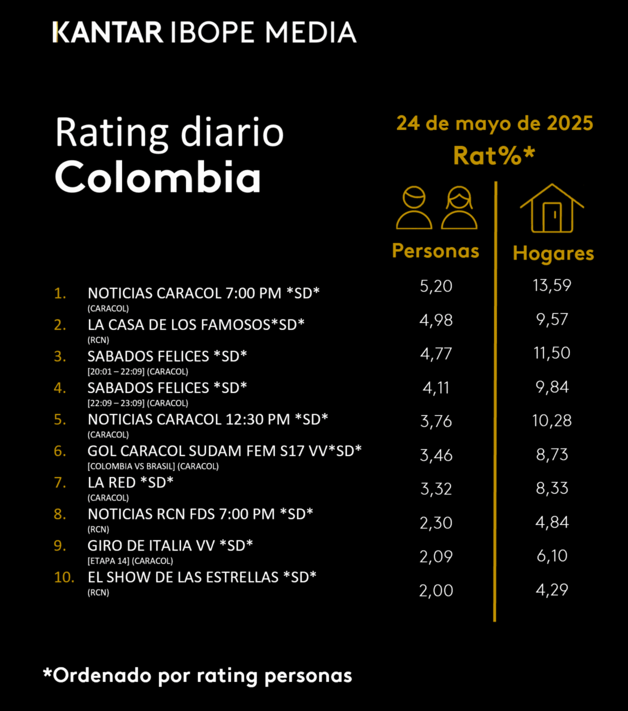INICIO > ÍNDICES DE SINTONÍA - CORTESÍA DE KANTAR IBOPE MEDIA > 24 DE MAYO DE 2025