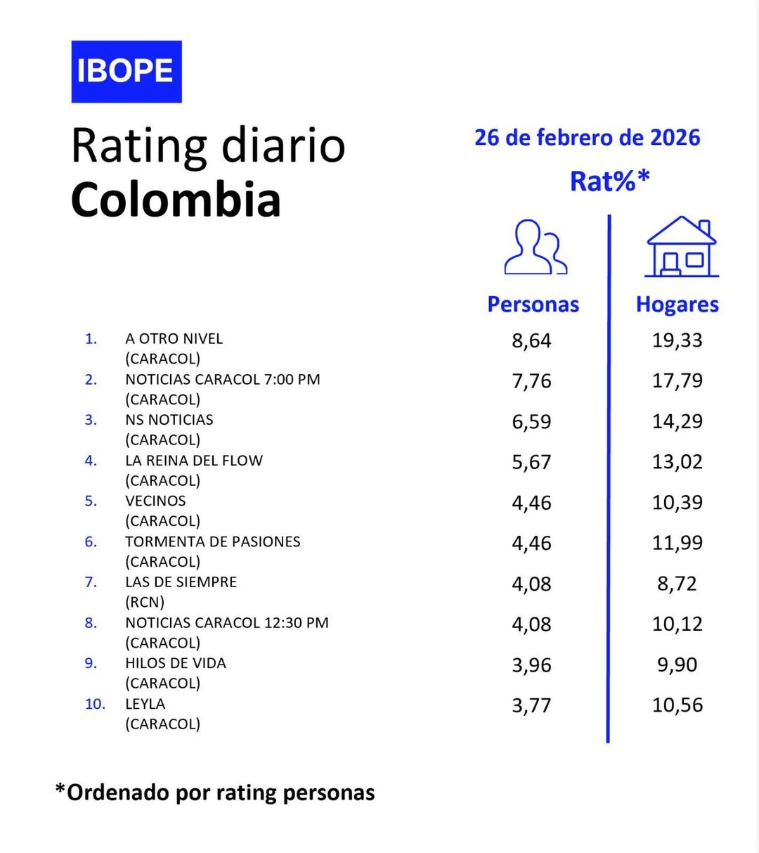 INICIO > ÍNDICES DE SINTONÍA - CORTESÍA DE KANTAR IBOPE MEDIA > 26 DE FEBRERO DE 2026