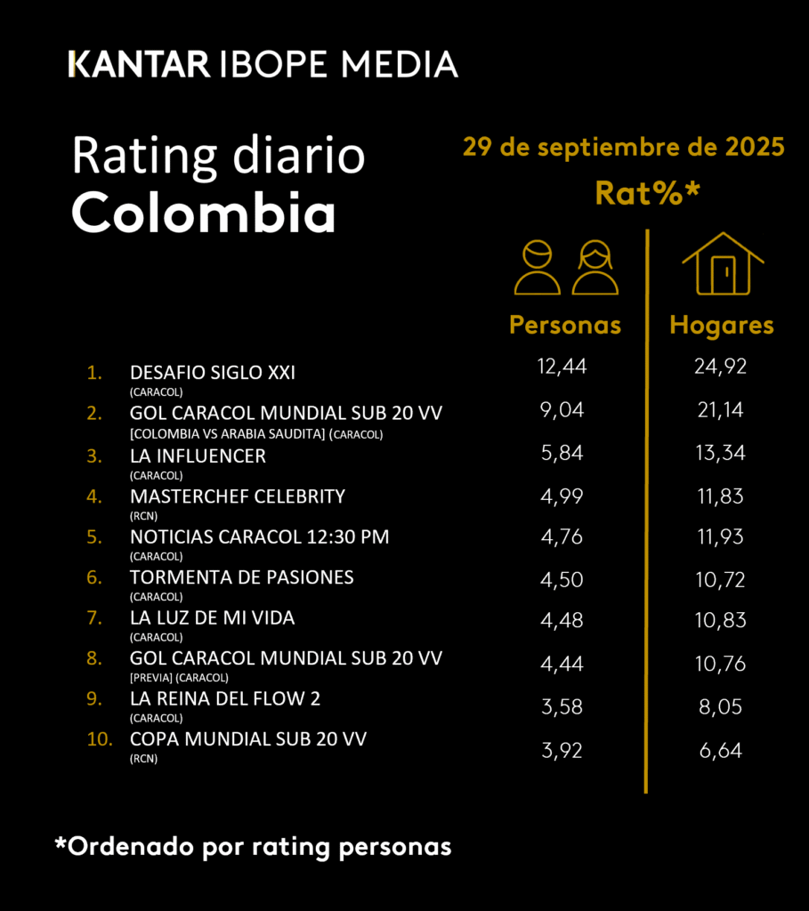 INICIO > ÍNDICES DE SINTONÍA - CORTESÍA DE KANTAR IBOPE MEDIA > 29 DE SEPTIEMBRE DE 2025