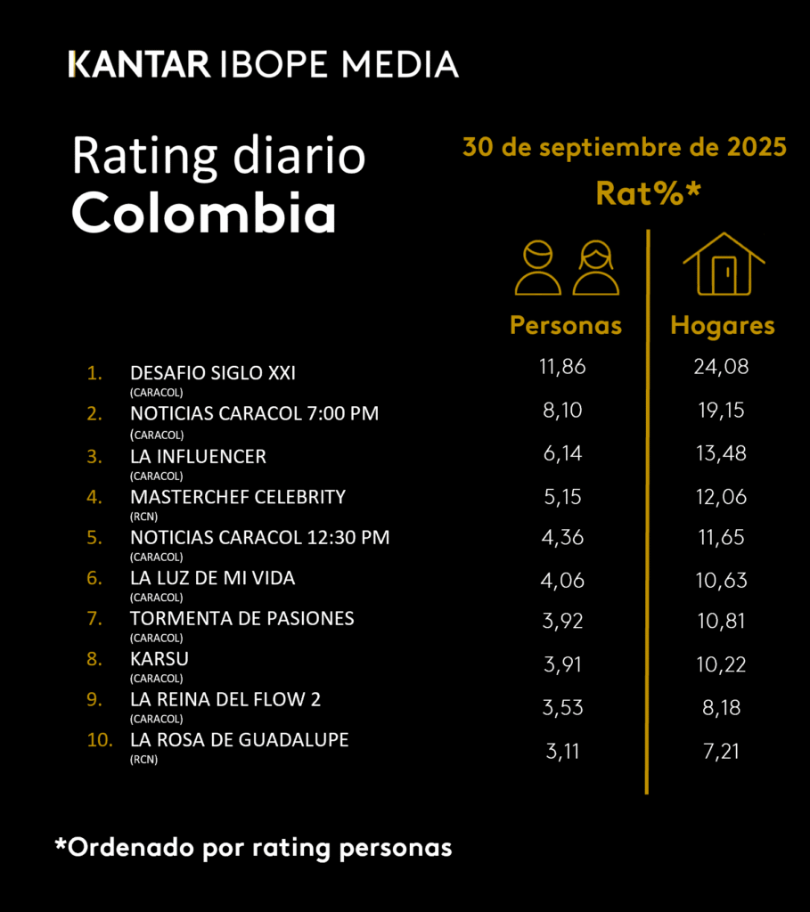 INICIO > ÍNDICES DE SINTONÍA - CORTESÍA DE KANTAR IBOPE MEDIA > 30 DE SEPTIEMBRE DE 2025