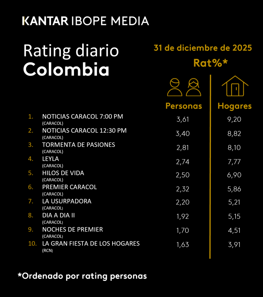 INICIO > ÍNDICES DE SINTONÍA - CORTESÍA DE KANTAR IBOPE MEDIA > 31 DE DICIEMBRE DE 2025