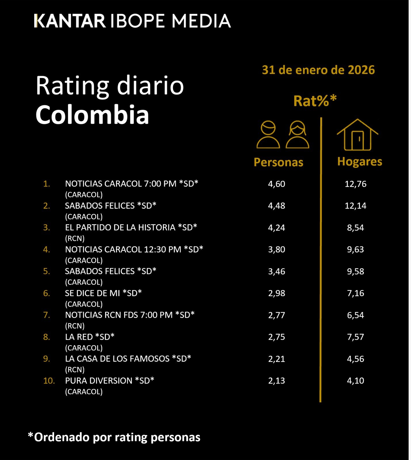 INICIO > ÍNDICES DE SINTONÍA - CORTESÍA DE KANTAR IBOPE MEDIA > 31 DE ENERO DE 2026
