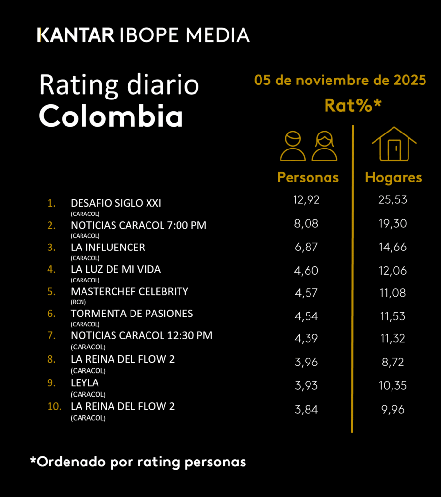 INICIO > ÍNDICES DE SINTONÍA - CORTESÍA DE KANTAR IBOPE MEDIA > 5 DE NOVIEMBRE DE 2025