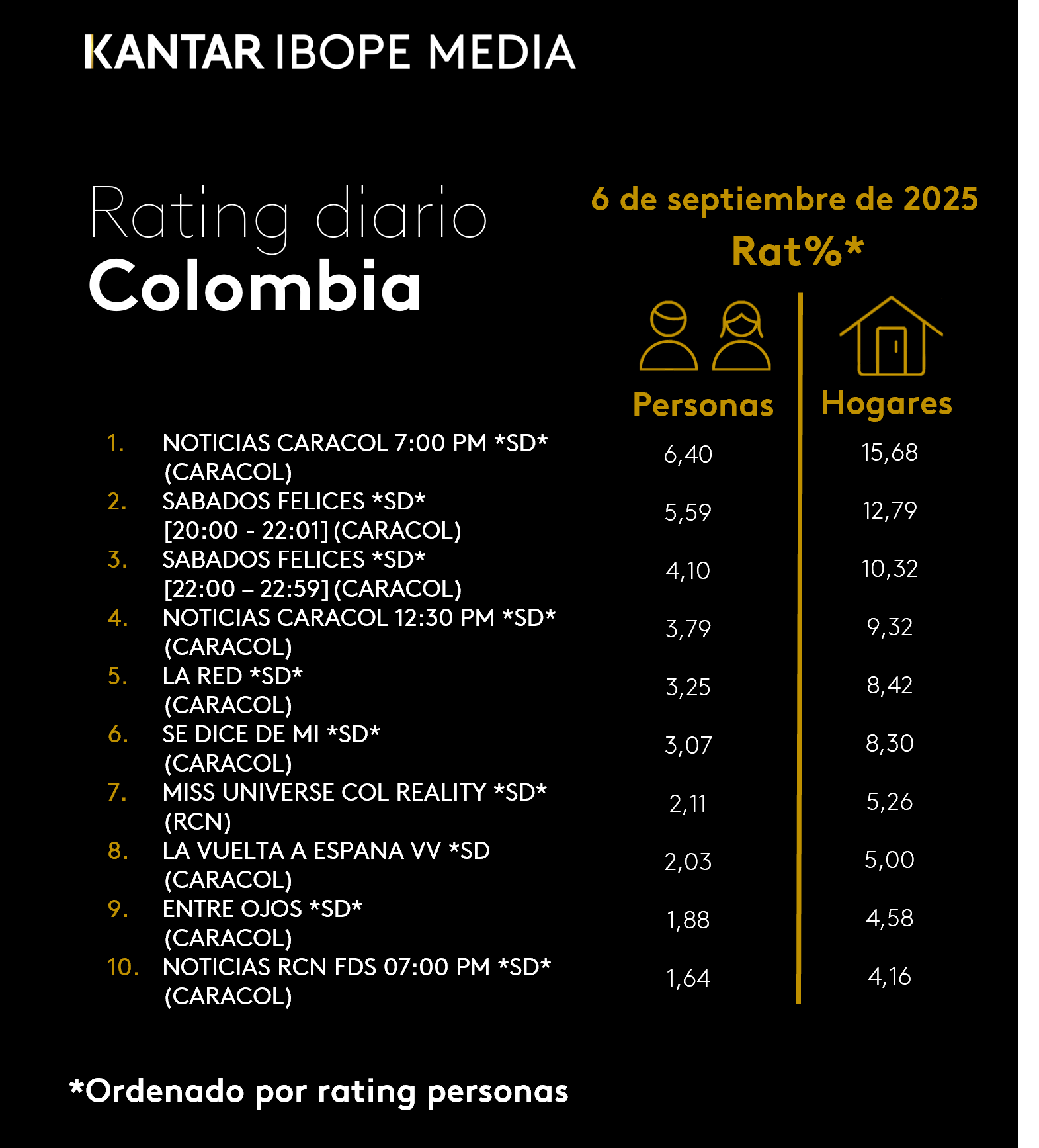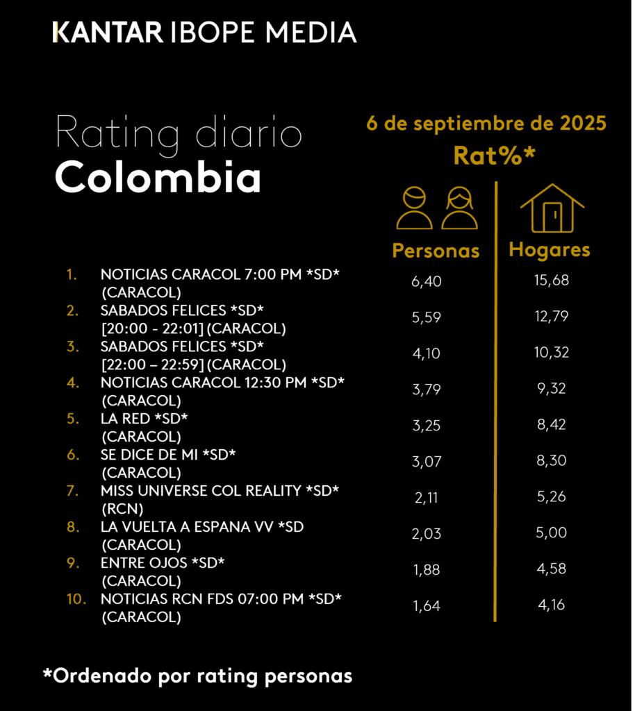 INICIO > ÍNDICES DE SINTONÍA - CORTESÍA DE KANTAR IBOPE MEDIA > 6 DE SEPTIEMBRE DE 2025