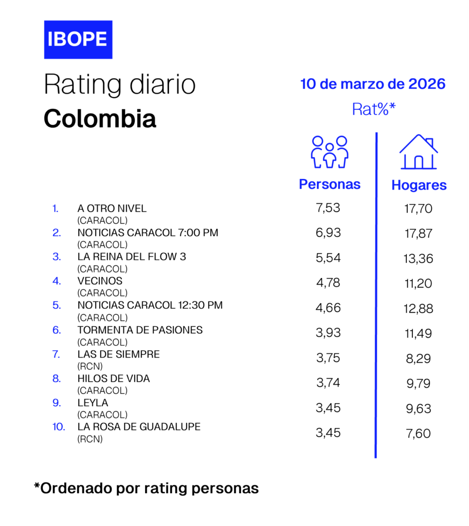 INICIO > ÍNDICES DE SINTONÍA - CORTESÍA DE KANTAR IBOPE MEDIA > 10 DE MARZO DE 2026