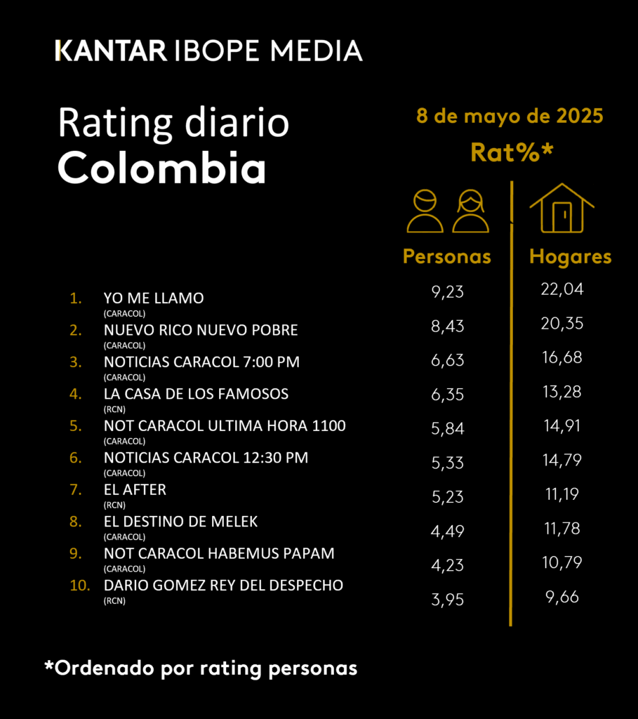 INICIO > ÍNDICES DE SINTONÍA - CORTESÍA DE KANTAR IBOPE MEDIA > 8 DE MAYO DE 2025