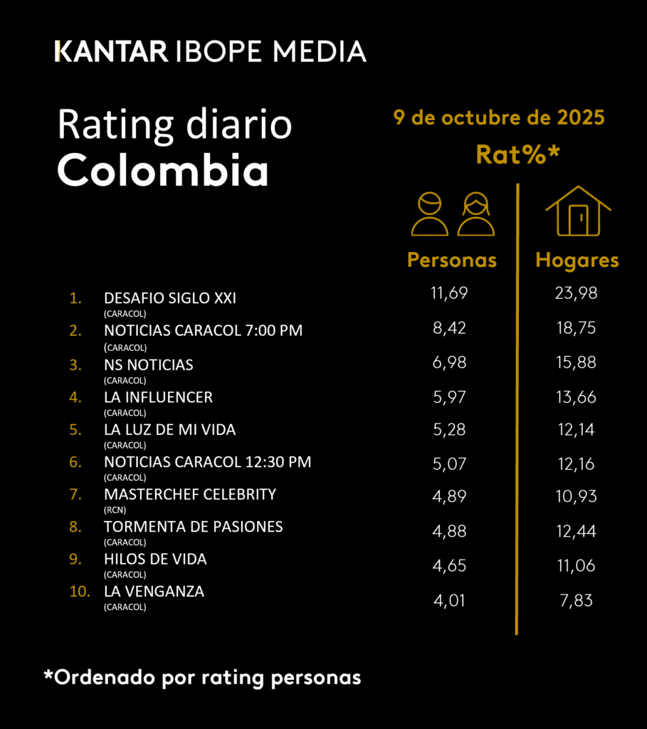 INICIO > ÍNDICES DE SINTONÍA - CORTESÍA DE KANTAR IBOPE MEDIA > 9 DE OCTUBRE DE 2025