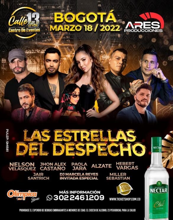 LAS ESTRELLAS DEL DESPECHO 18 DE MARZO en las instalaciones del Centro de eventos Calle 13 Hall Bogotá @jhonalexcastano @nelsonvelasquezd @paolajarapj @hebertvargas @alzatemusica @jairsantrich @millersebastianoficial Invitada Especial @marcelareyes INFORMES @ticketshopcol Celular...