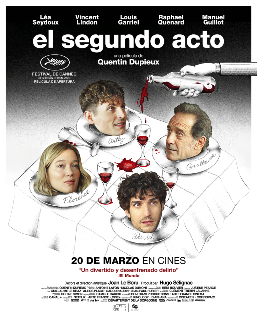 El irreverente director francés Quentin Dupieux (Daaaaali!; Yannick) regresa a la cartelera colombiana con EL SEGUNDO ACTO, la película escogida para inaugurar el Festival de Cannes en 2024. Protagonizada por un elenco potente: Léa Seydoux (Blue is the Warmest Colour; Dune. Part Two), Vincent Lindon (Titane; La loi du marché), Louis Garrel (Mujercitas; The Dreamers) y Raphaël Quenard (Yaanick; Conte Nupcial), esta nueva comedia surrealista de Dupieux desafía las reglas del cine y juega con los límites entre la realidad y la ficción, al tiempo que realiza un homenaje a los oficios cinematográficos mientras escarba en la cotidianidad de un set de filmación.