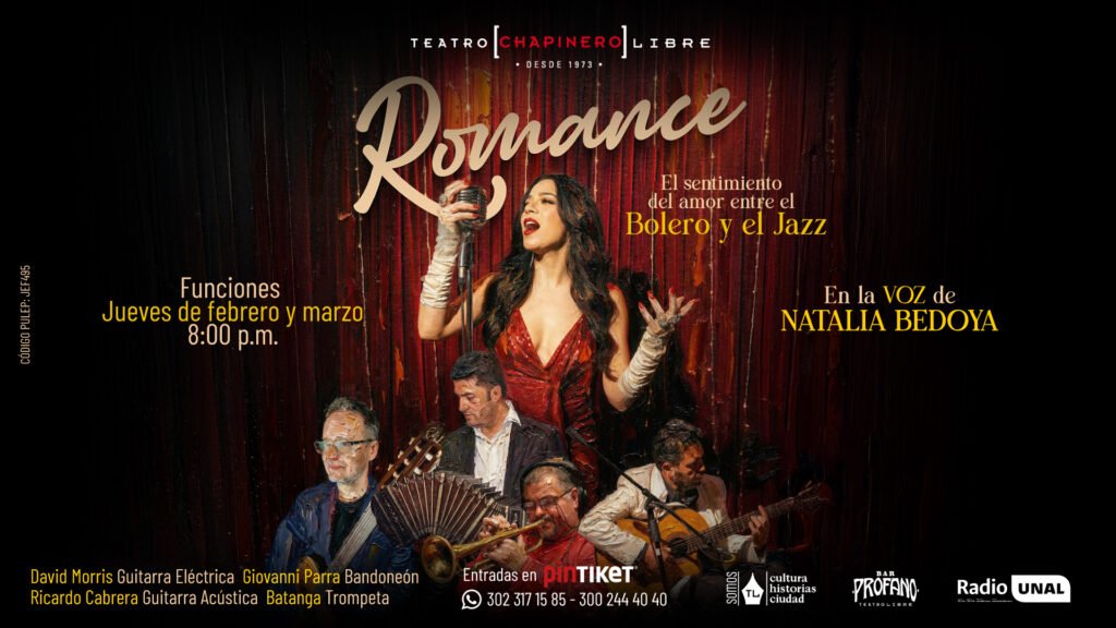 “Romance” es un concierto protagonizado por Natalia Bedoya junto a su ensamble musical, una propuesta que la confirma como una de las voces más sólidas y reconocidas de la escena nacional. Ganadora de importantes premios y con una trayectoria ampliamente valorada por la crítica y el público, su voz se convierte en el hilo conductor de una noche donde el bolero y el jazz se encuentran, se abrazan y despiertan emociones intensas.