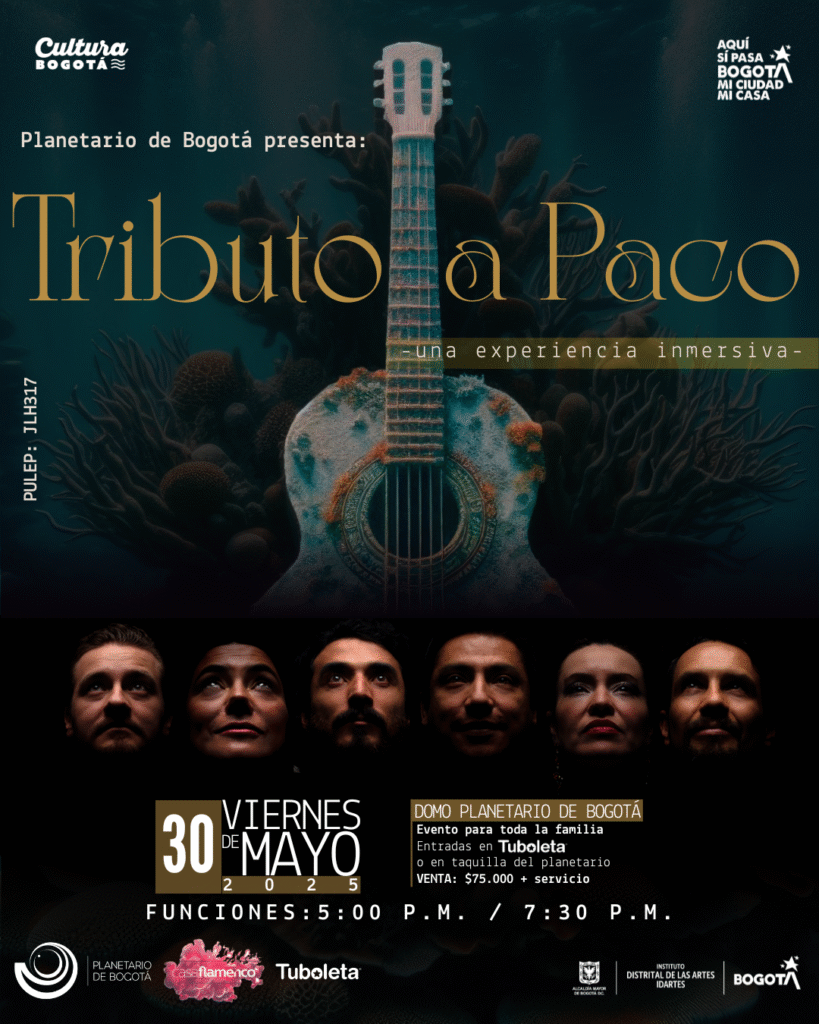 Una cuerda vibra y el silencio cede, abriéndole paso al ritmo, la emoción y la memoria. La guitarra suena y el aire cambia, un solo rasgueo basta para convocar décadas de historia y la fuerza cruda del flamenco. Este viernes 30 de mayo, en el corazón de Bogotá, el domo del Planetario recibe un espectáculo que trasciende el tiempo: “Tributo a Paco” Una Experiencia Inmersiva, un homenaje al hombre que reinventó la guitarra y llevó el arte flamenco al mundo. No se trata solo de recordar a un artista, sino de entrar en su universo a través de una experiencia sensorial única, donde se fusionan proyecciones en formato domo, música en vivo, cante y baile.