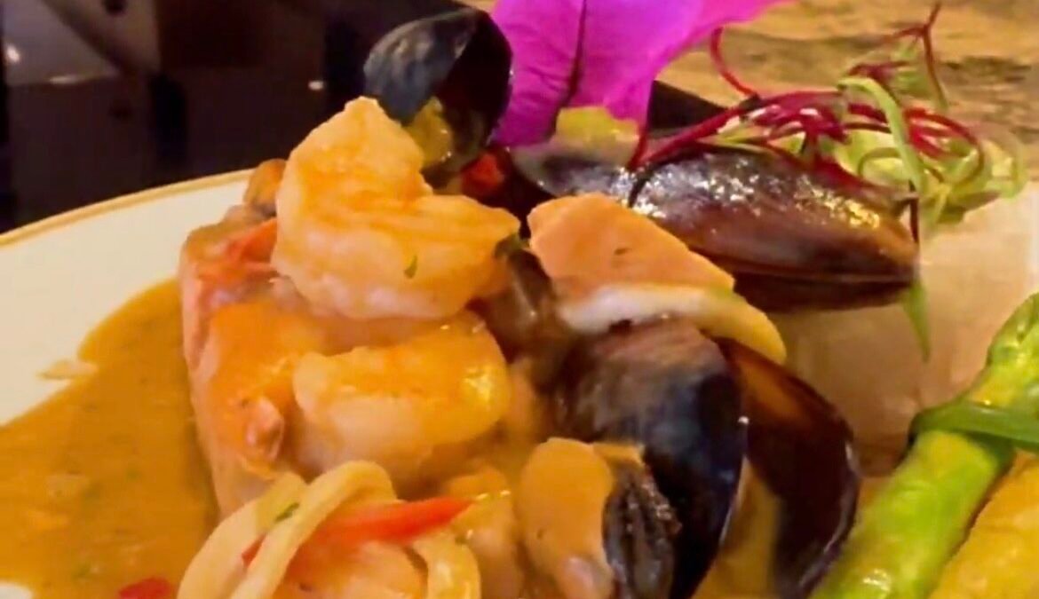 Este plato tiene como base un filete de pescado grueso, como el salmón, que mantiene su firmeza durante la cocción. Se acompaña con una selección de mariscos como camarón, calamar, mejillones y langostinos, realzados con una salsa marinera cremosa. La base de la salsa se elabora con ajo, pimentón, tomate, apio y cilantro, que aportan frescura y equilibrio al plato. La crema de leche y el bisque de mariscos añaden textura y profundidad al sabor.